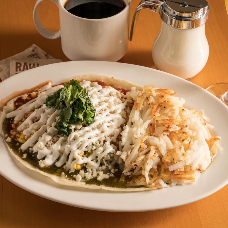 Flour tortilla, refried black beans, two eggs any style, choice of Red Chipotle or Poblano Green Chile, crema mexicana, cilantro, onion, queso fresco, hash browns • Add Avocado +$4.50