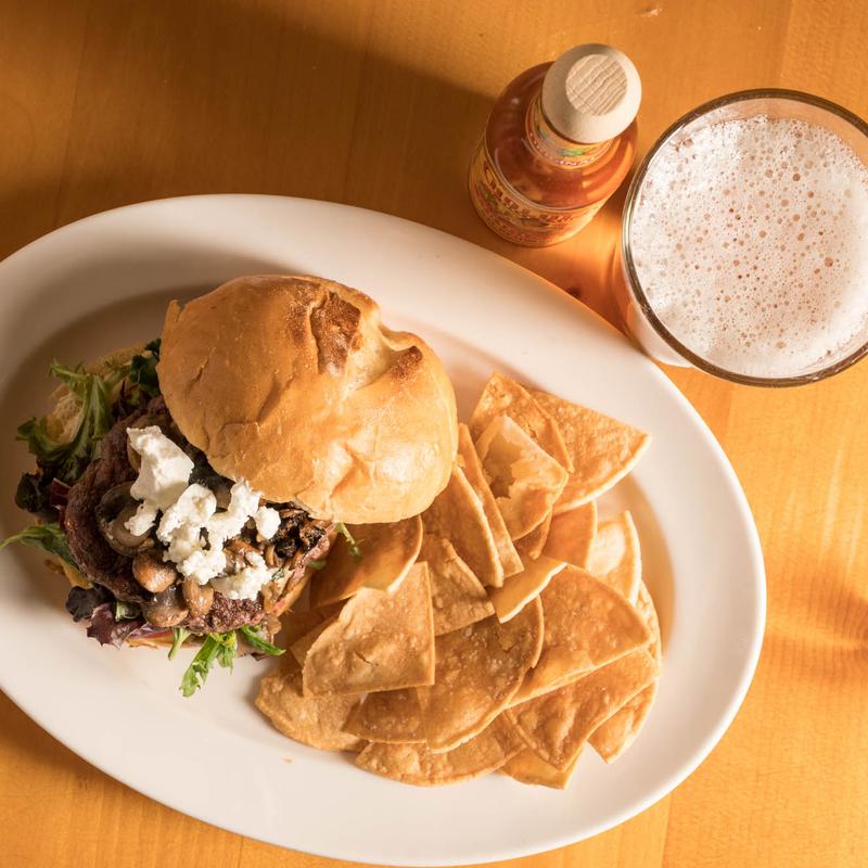 Challah bun, LTO, local beef, goat cheese, mushrooms, chimayo mayo, field green salad, or corn tortilla chips.